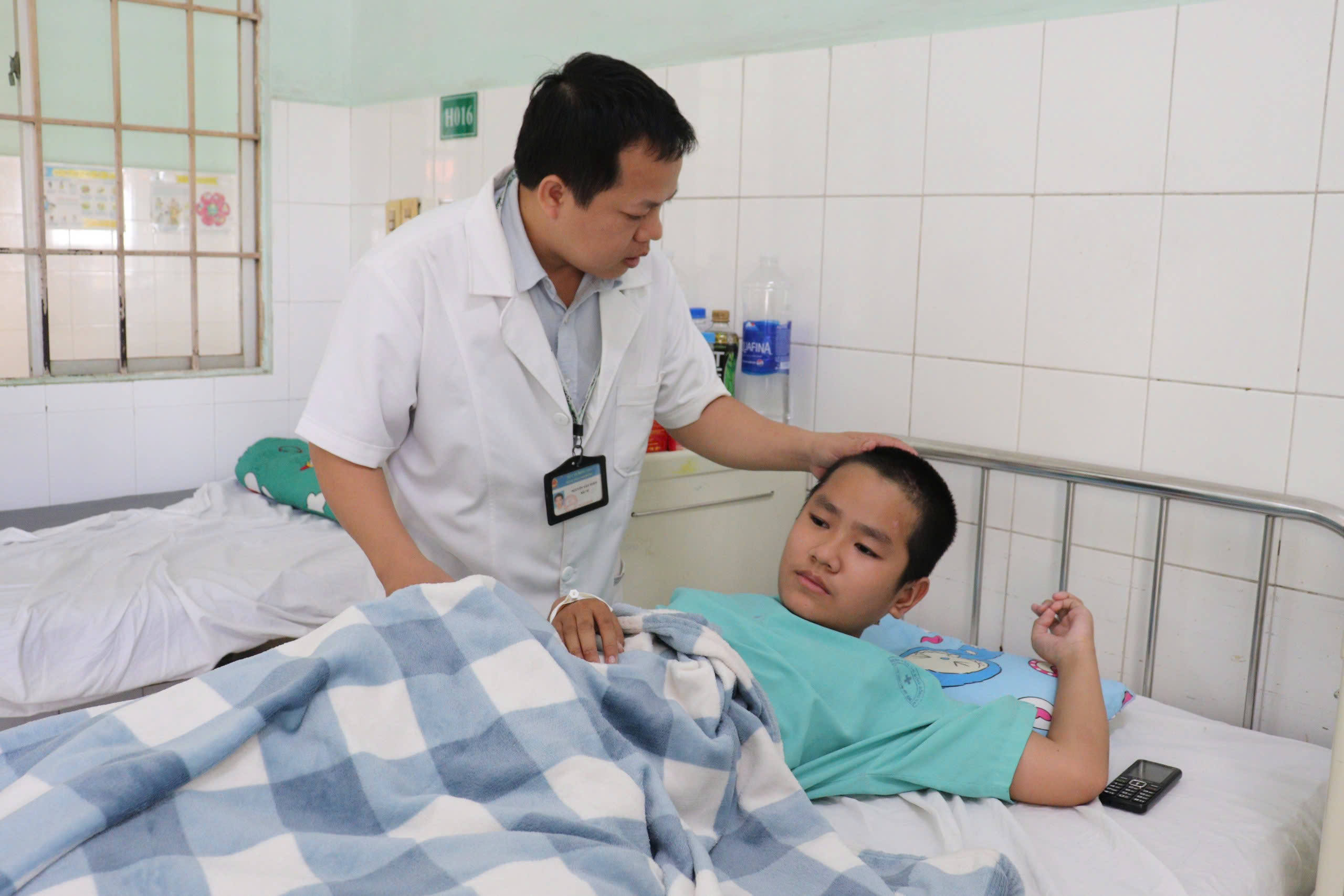 Bác sĩ Nguyễn Văn Toàn thăm khám và kiểm tra vết khâu vùng đầu cho bệnh nhi sau một tuần Hzz88.com lì xì hội viên mới chấn thương sọ não.