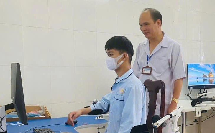 Bác sĩ hướng dẫn bệnh nhân tập hồi phục vận động chi trên bằng robot tại Hz888 trang chủ nhà cái.