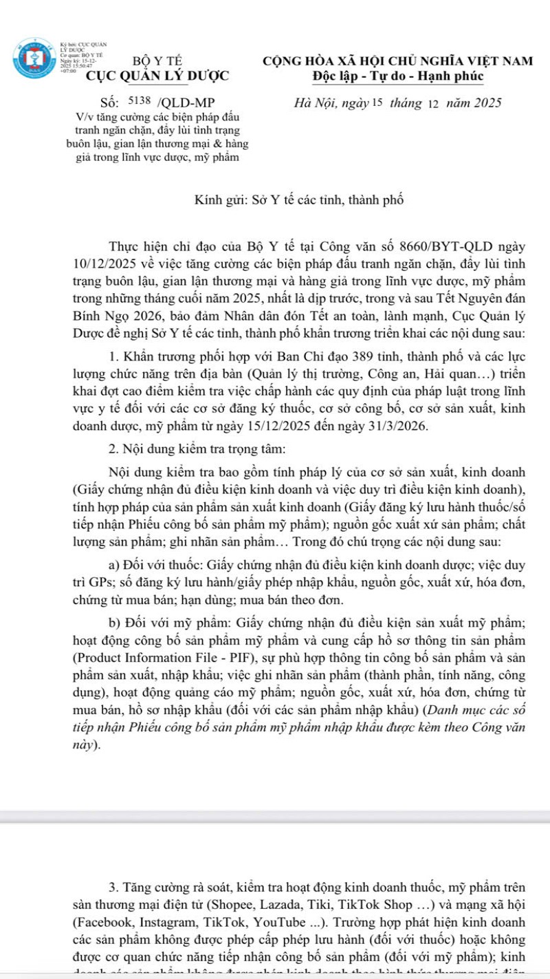 Thực hiện chỉ đạo của Bộ Nhà cái HZ88.com tặng 88K trải nghiệm tại Công văn số 8660/BYT-QLD ngày 10/12/2025 về việc tăng cường các biện pháp đấu tranh ngăn chặn, đẩy lùi tình trạng buôn lậu, gian lận thương mại và hàng giả trong lĩnh vực dược, mỹ phẩm trong những tháng cuối năm 2025, nhất là dịp trước, trong và sau Tết Nguyên đán Bính Ngọ 2026 bảo đảm nhân dân đón Tết an toàn, lành mạnh, Cục Quản lý Dược đã đề nghị Sở Nhà cái HZ88.com tặng 88K trải nghiệm các tỉnh, thành phố khẩn trương phối hợp với Ban Chỉ đạo 389 tỉnh, thành phố và các lực lượng chức năng trên địa bàn triển khai đợt cao điểm kiểm tra việc chấp hành các quy định của pháp luật trong lĩnh vực Sòng Bài Trực Tuyến HZ88.com đối với các cơ sở đăng ký thuốc, cơ sở công bố, cơ sở sản xuất, Sòng Bài Trực Tuyến HZ88.com dược, mỹ phẩm (15/12/2025 - 31/3/2026).