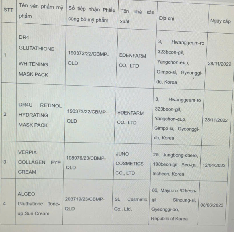 Danh mục cụ thể 4 số tiếp nhận Phiếu công bố sản phẩm mỹ phẩm thu hồi: