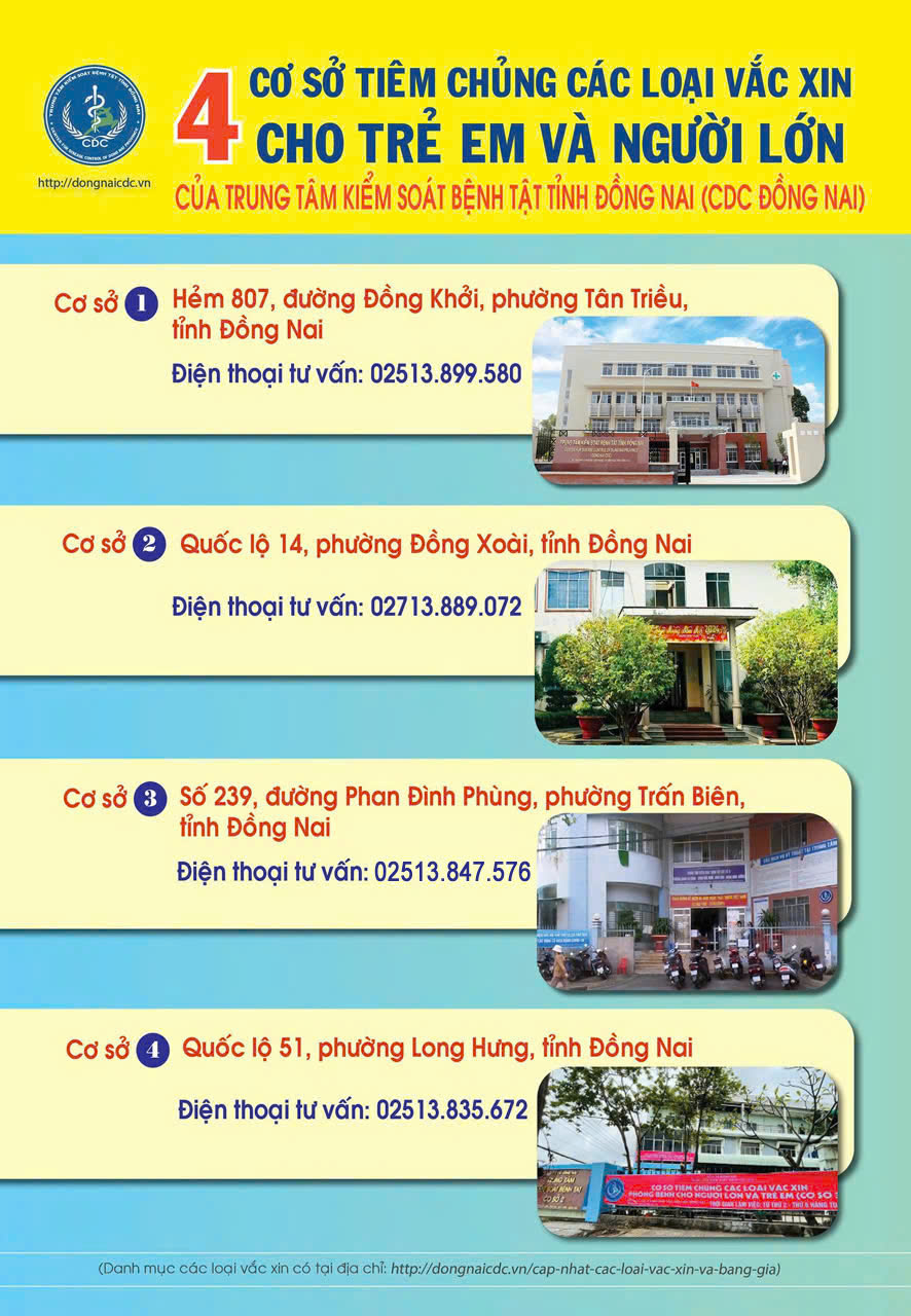 * Phòng tiêm chủng Cơ sở 1: Hẻm 807, đường Đồng Khởi, phường Tân Triều, tỉnh Đồng Nai,