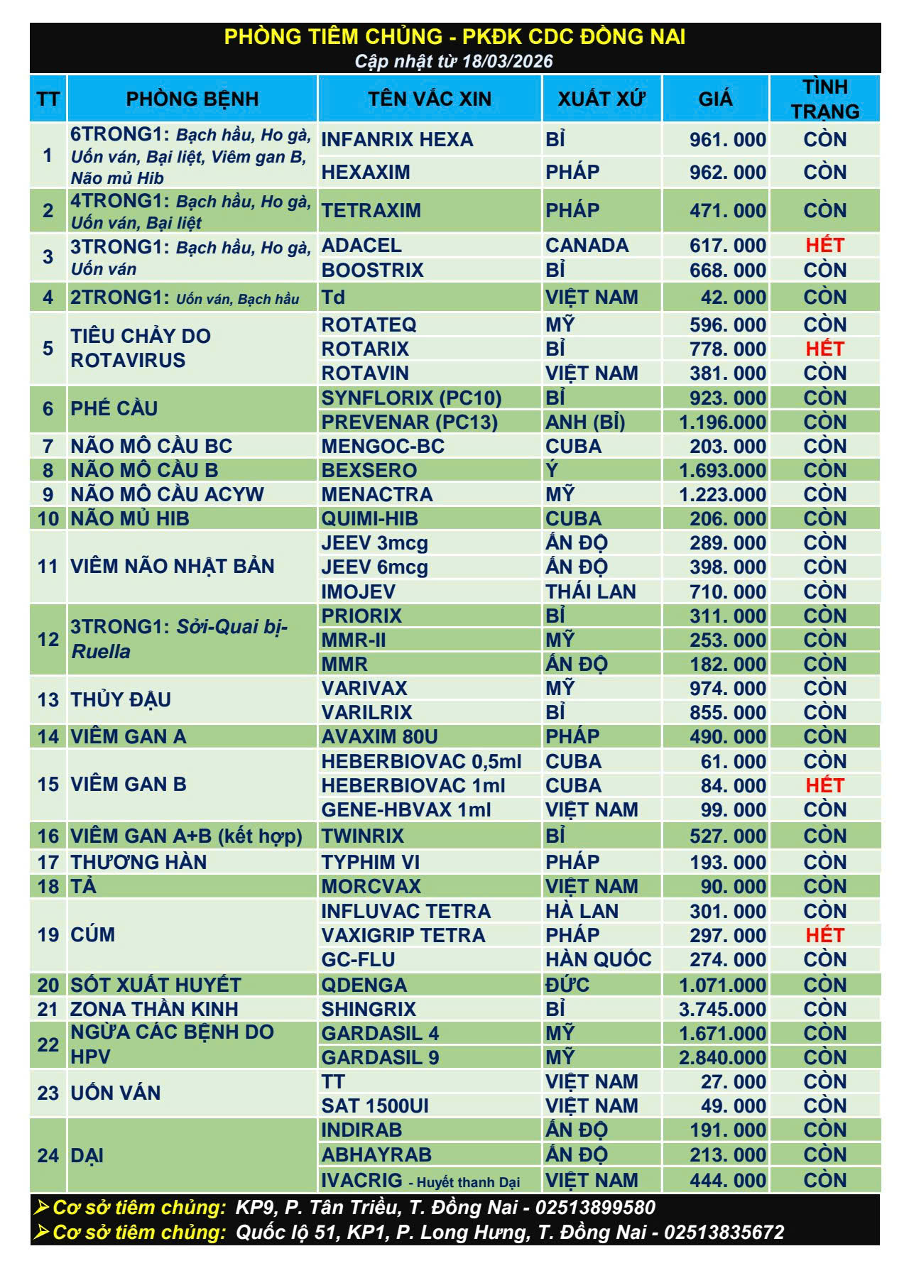 VÀ BẢNG GIÁ CÁC LOẠI VẮC XIN CHO TRẺ EM VÀ NGƯỜI LỚN TẠI CDC ĐỒNG NAI