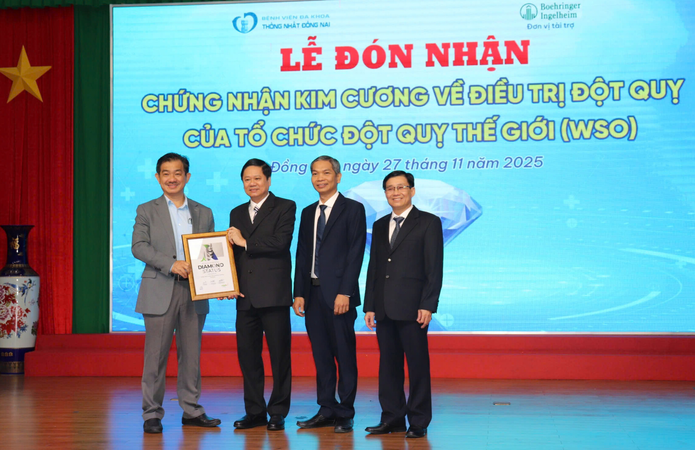 Chất lượng điều trị đột quỵ tại Đồng Nai ngày càng được nâng cao, từng bước đáp ứng các tiêu chuẩn quốc tế. (Trong ảnh: Lãnh đạo Link Đăng Ký HZ88.com ĐK Thống Nhất đón nhận chứng nhận Kim cương trong điều trị đột quỵ của Hội đột quỵ thế giới).
