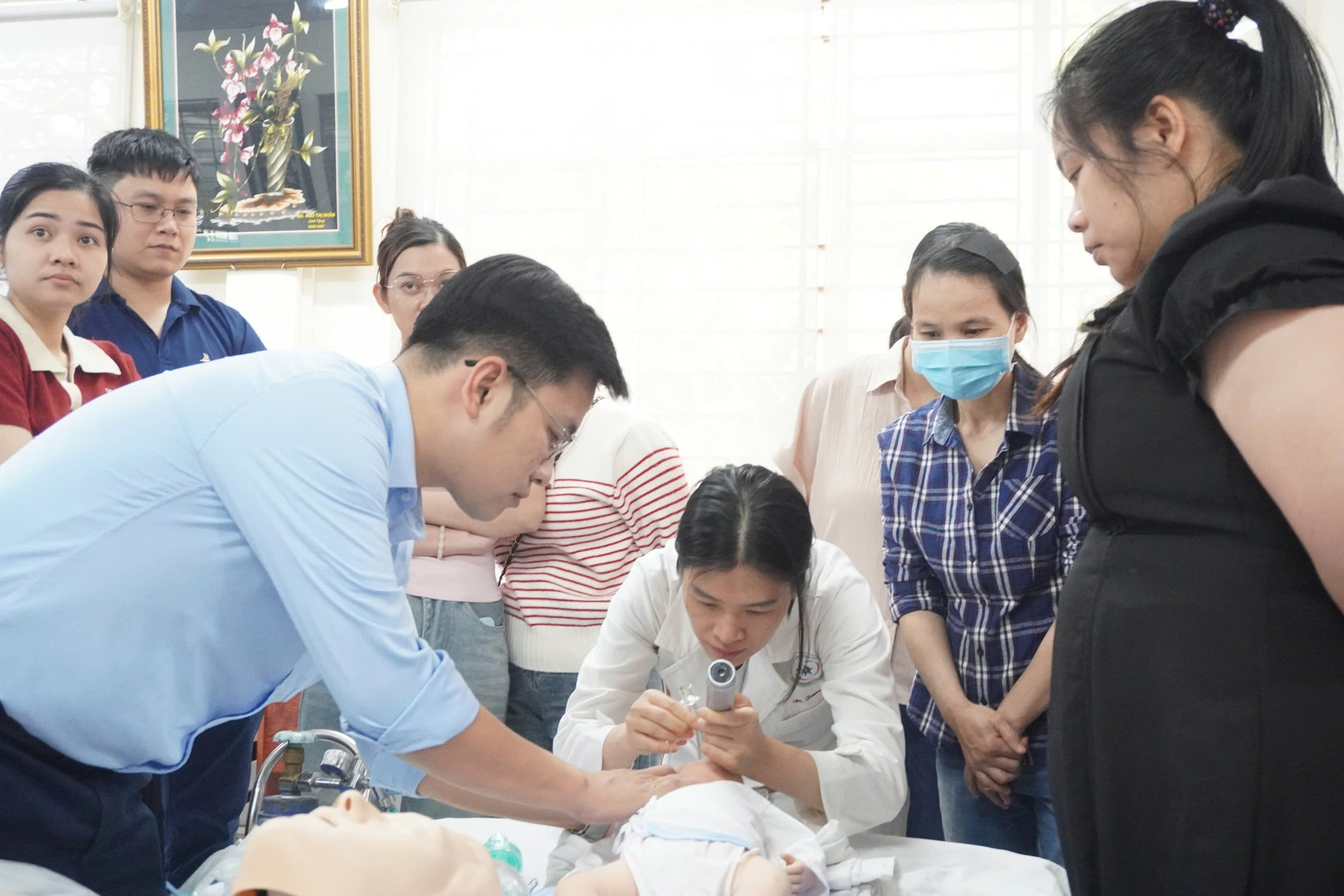 Các học viên được hướng dẫn và tham gia thực hành cấp cứu trên mô hình.
