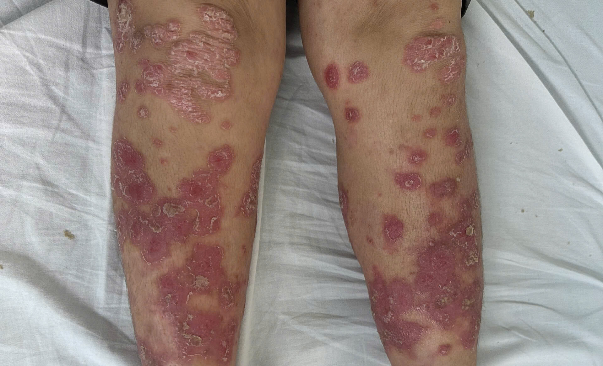 Triệu chứng rõ ràng nhất khi mắc bệnh vảy nến là trên da người bệnh sẽ xuất hiện các sẩn, mảng đỏ tươi, giới hạn rõ, bề mặt bong vảy trắng, thường xuất hiện đối xứng ở khuỷu tay, đầu gối, da đầu hoặc vùng da hay bị cọ xát. Ngoài ra, bệnh có thể gây biến đổi ở móng tay, móng chân khiến móng trở nên xù xì, mất bóng; tổn thương các khớp gây sưng đau; thậm chí ảnh hưởng đến tim mạch, hệ tiêu hóa hoặc Đăng Ký HZ888 Lì Xì 111K tinh thần của người bệnh.