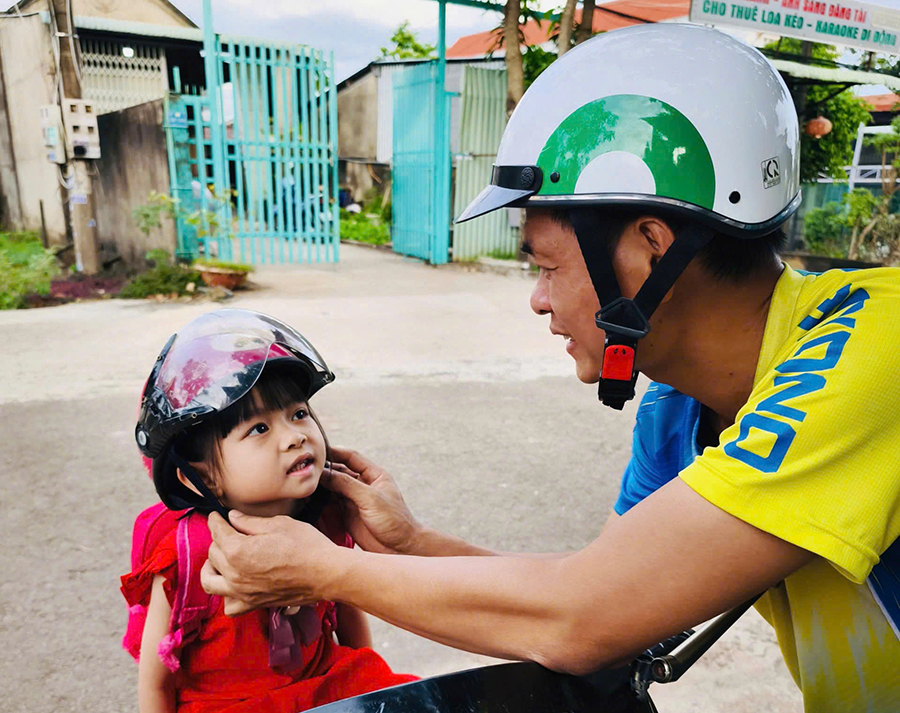 Khi cho trẻ ngồi sau xe máy phụ huynh cần đội mũ bảo hiểm cho trẻ.